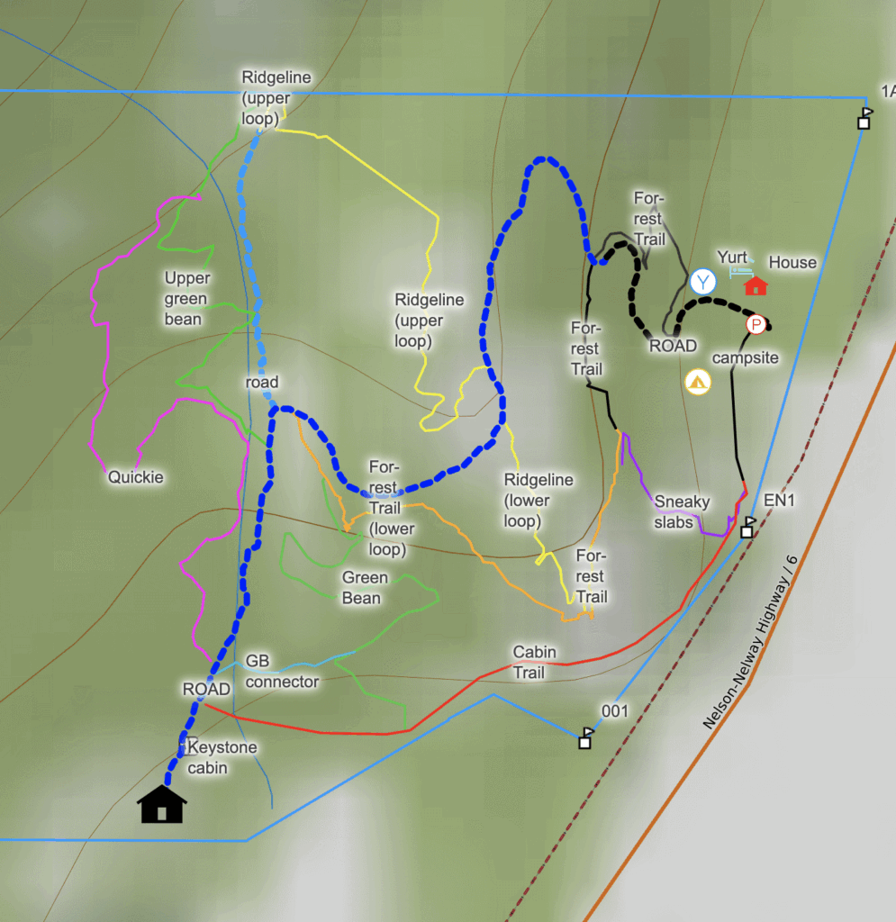 Going clockwise from the parking to Cabin Trail > Green Bean > Upper Green Bean > Ridgeline > For-rest Trail > Sneaky Slabs (or West on For-rest Trail back to Green Bean & Cabin Trail). Extended Ride: Cabin Trail > Lower Green Bean > Upper Green Bean >Quickie > Connector to Green Bean > Repeat Lower & Upper Green Bean to Ridgeline > For-rest Trail > Sneaky Slabs